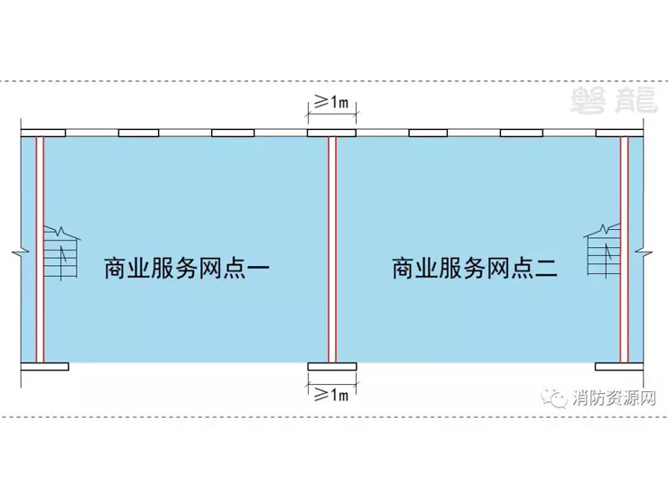图示2:不同单元两两之间的洞口,参照《建规》6.2.5设置防火分隔措施,同时,应加强日常安全管理,不应将货品摆放至门店外,防止货品连成一片的情况发生: